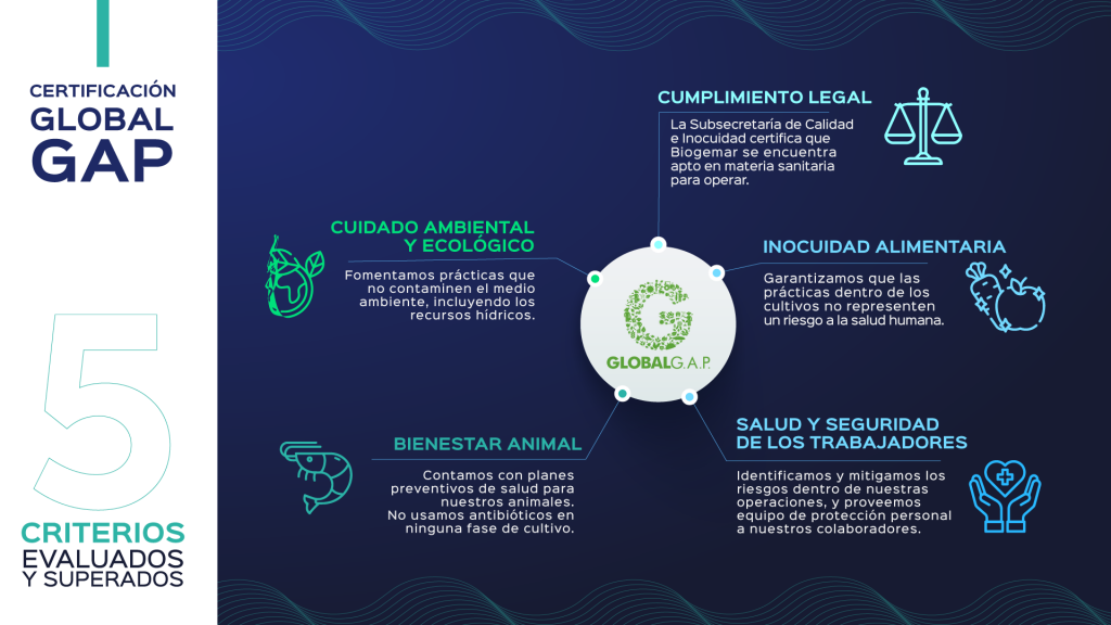 Nuestra división de biotecnología y genética marina, Biogemar, cuenta con la Certificación Global G.A.P., la misma que busca establecer normas y requisitos dentro de las empresas, con el fin de mejorar los procesos de las industrias agrícola y acuícola. Entre estas normas se incluyen indicadores en seguridad alimentaria, el medio ambiente y la biodiversidad, el bienestar de los trabajadores, la trazabilidad y el bienestar animal.